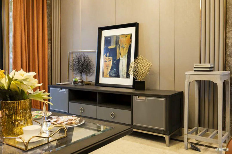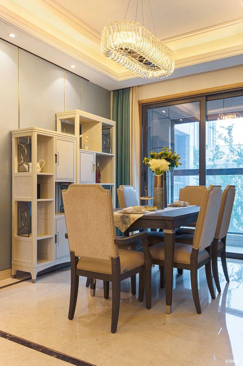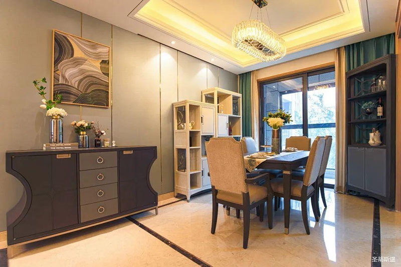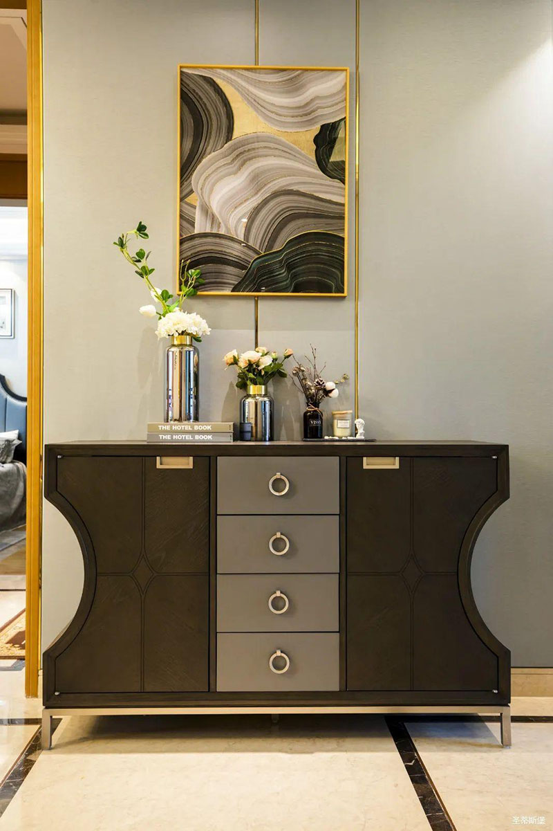 米白色餐边柜坐落餐厅一角,简约沿框线条,层次分明。金属半圆与实木镶嵌,尽显优雅轻奢的姿态。