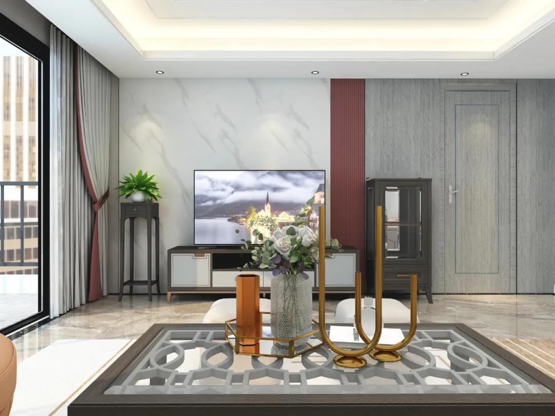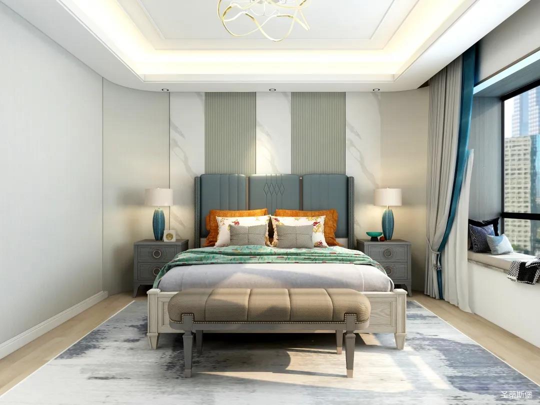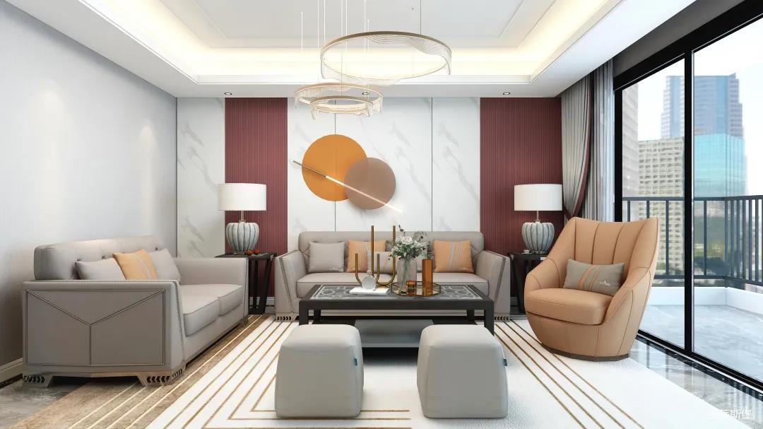 客厅在空间摆设上错落有致,看似不统一的空间,在观感上却给人以整齐划一的感官体验,诺大的客厅区域由于大面积落地窗设计,充满了自然光线,营造明亮和舒适的氛围感,细节的几何型灯具为室内增加照明强度,增添了温馨感。现代的简洁与美式轻奢的气质相结合,散发着沉稳,而又不失清新的优雅格调。