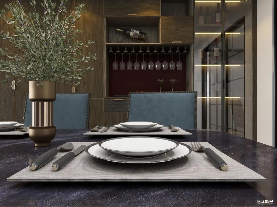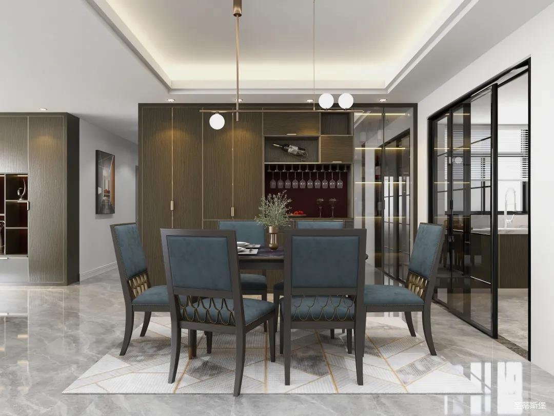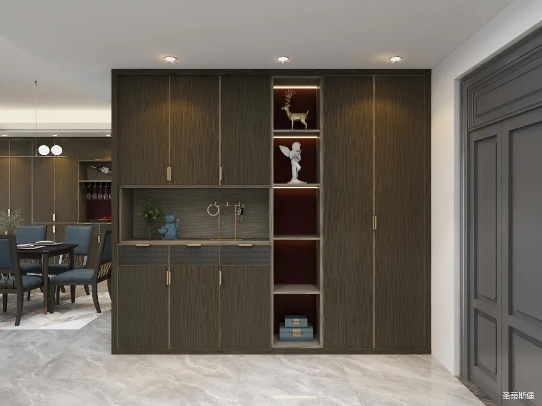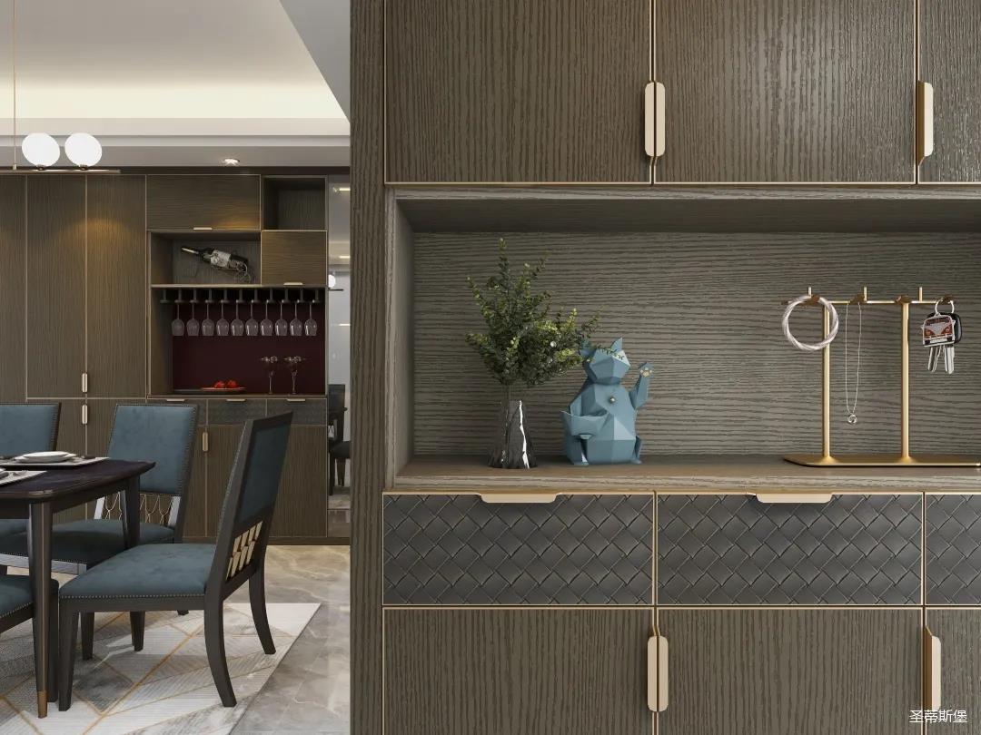 材质的交替与光影的变换,具有浓浓的现代简奢色彩。独一无二的英伦爵士灰定制柜,由延边镶嵌的香槟金拉丝金属分割,线条流畅且奢华,不仅代表着时尚,也崇尚了实木韵味。设计师将现代、实用、精致的艺术设计风格应用其中,更是精致生活方式的艺术演绎。在平静的空间中表现出独特的艺术骨感,满足我们对精致生活的精神追求。