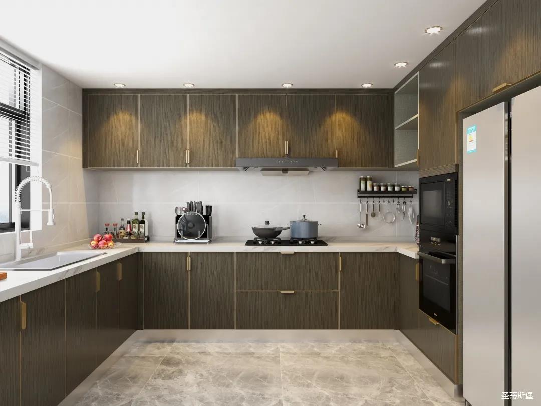 u型空间格局,设计师将功能区合理划分,让洗切煮一气呵成。以米白水磨石+英伦爵士灰实木为主导的橱柜系统中,人体工学流线,让每一细节都折射出屋主对生活的考究,一厨一柜,每一处都关乎着我们对生活的热忱。