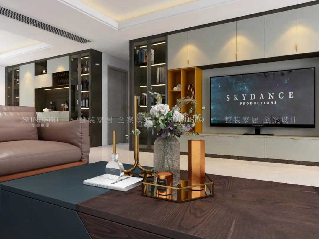 客厅一面置顶的定制柜,大大增加了空间收纳,也将电视背景墙的观赏性发挥到极致。浅灰与明亮橙的“动静”属性,与沙发上的爱马仕橙相呼应,从空间中漫溢出欢乐和跳动的乐章,回响生活中那一抹绚丽和精致,同时也拥有着对立且和谐的高级范儿。