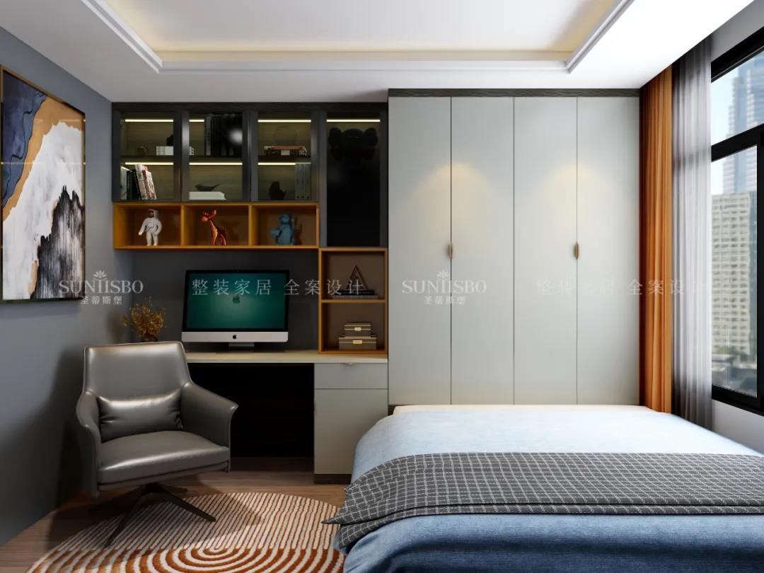 设计师运用最为百搭浅灰实木护墙板打造主卧空间,简约的线条纵横交错,带来了干净、清爽、舒适的视觉效果。明暗分区的衣柜在灯光的渲染下,虚实光影变换其中,为每个角落氤氲出浪漫的气息。