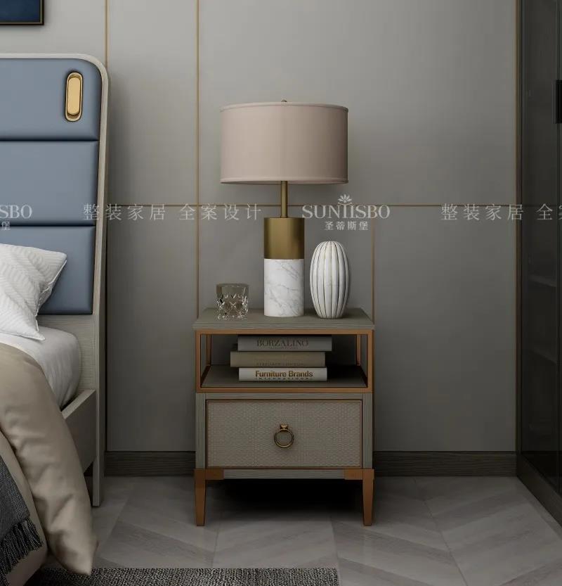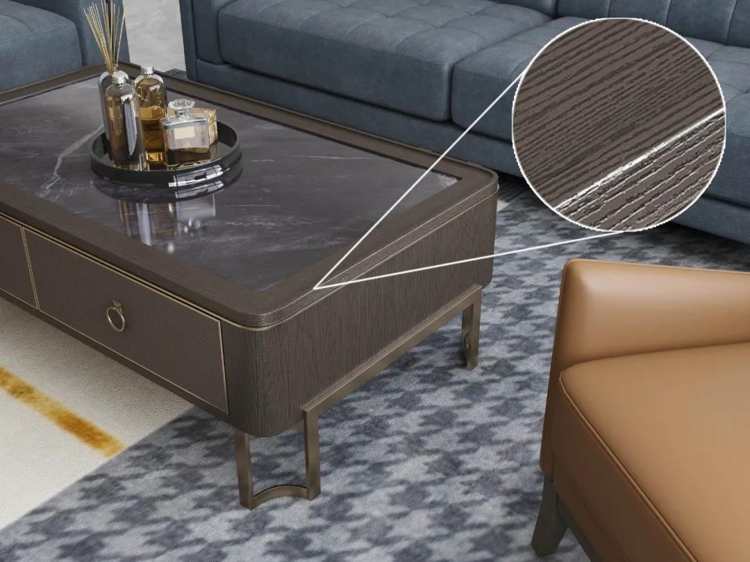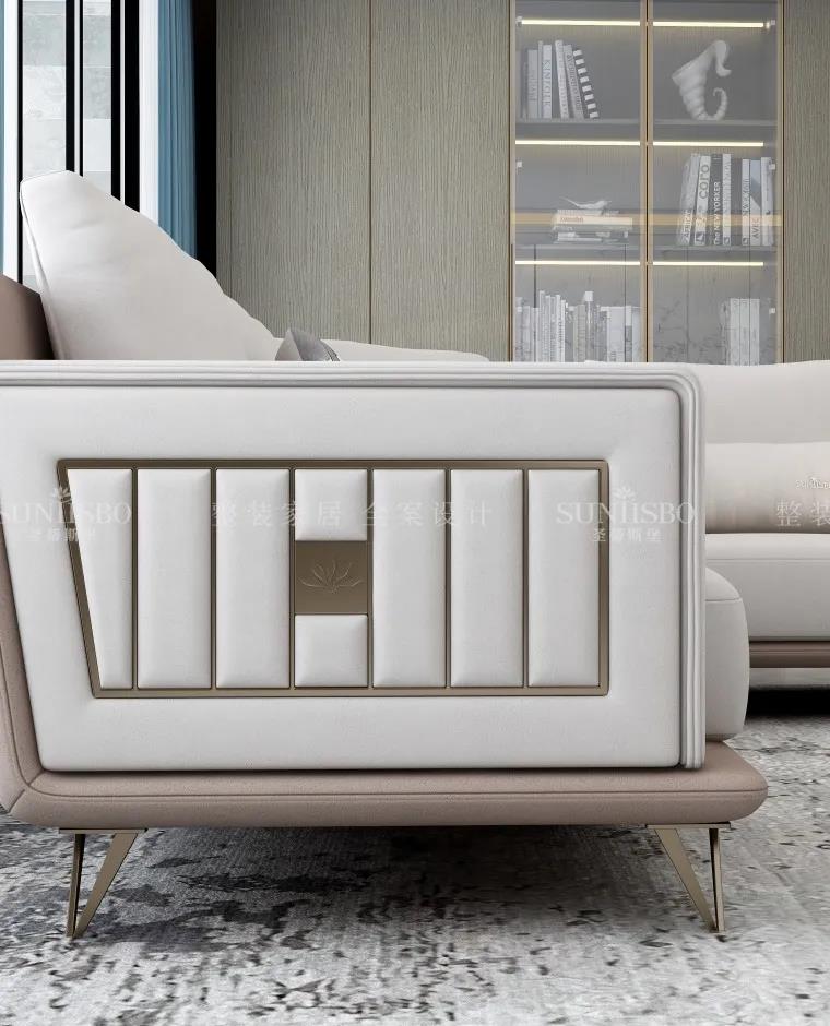 洛斯系列在现代时尚的基础上还增加了许多轻奢的金属元素,金属元素在轻奢风里毋庸置疑的存在。为什么人喜欢戴耳环、戒指、项链等首饰?为什么衣服、鞋子、包包上都能看到金属元素的身影?从时尚圈到家居界,金属元素凭借其独特的质感以及由内散发的高级气质,有着强大的包容性,提升风格格调,增添时尚气息。运用在家居中可成为整个空间的亮点,成为时下家居装修的潮流趋势,深受大家的喜爱。但是目前市面上采用金属镶嵌工艺的多数是在板木结合的基础上,难度相对简单易操作。在洛斯系列里,是在实木的基础上进行金属镶嵌工艺,要求精准度非常高,误差不得超过0.5毫米,不然就会对不齐。在洛斯系列中,桌子的四角与腿部、柜类门板,沙发腿部,茶几支架,餐桌台面,床品外框等都将金属恰到好处地融入到空间的每个角落,让空间拥有轻奢的高级感,提升空间的质感。将优雅谦逊的都市精致感全面呈现,让装修冷中带暖、沉静精致,也向人们展示了一种精致的生活方式,更为整个家注入灵动气息。