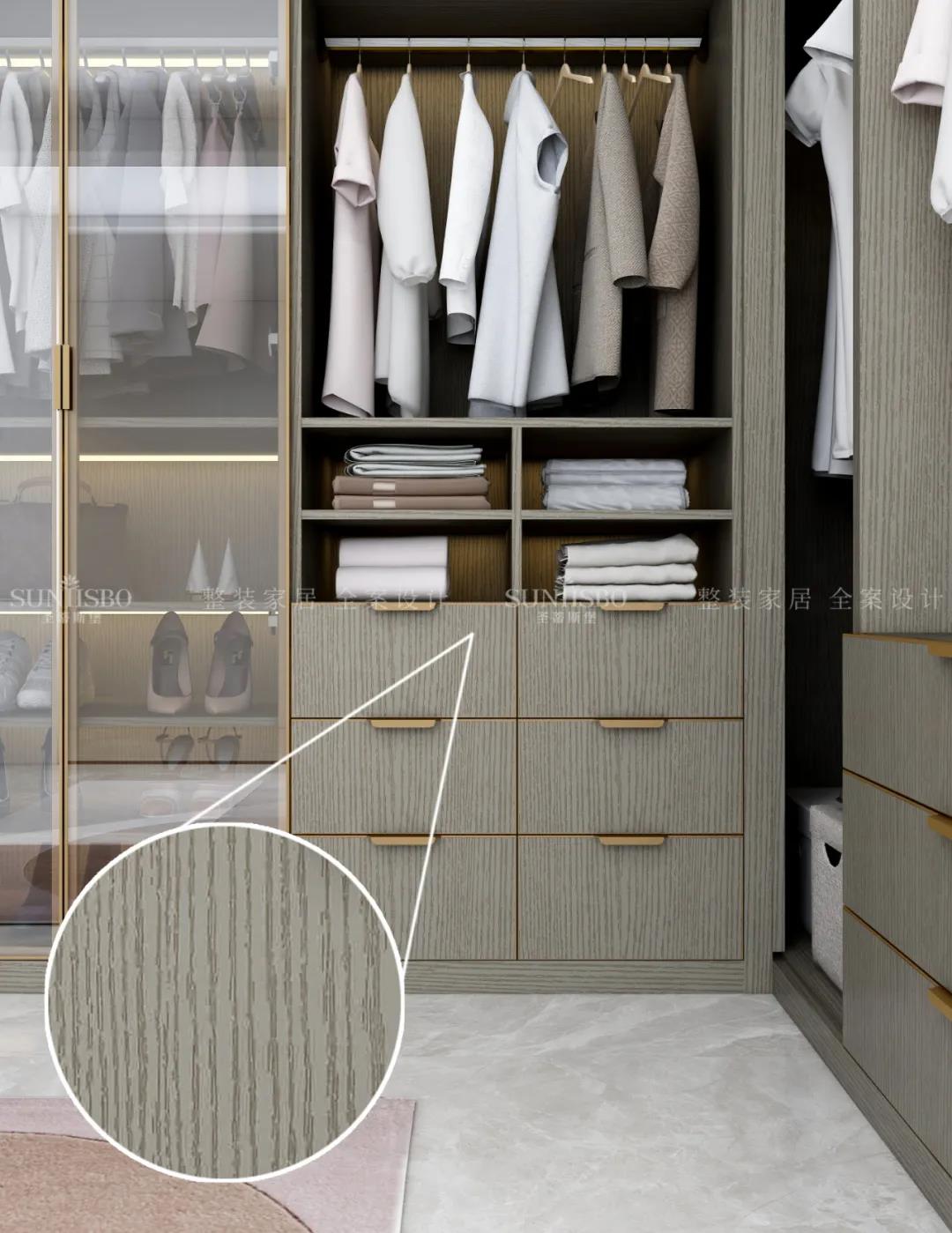 当下人对原生态材质的极致追求也是当下人回归自然的一个方式,现在很多高端的精装房墙上都是木饰面,这些木饰面都是贴木皮或者带木纹的产品,洛斯系列采用红橡直纹的实木压纹工艺,使木纹呈现河流的波纹状,第一可以保持很好的原木的质感的同时,也能够给空间带来一种灵动感,不会显得呆板与单调。由于木面的半开放式涂装,表面凹凸不平,深浅有致的设计,使产品在灯光下产生漫反射的光线折射,降低了整体产品和空间上的高光感,使人在心理上有更加柔和感受,更加有生活的气息,就像亚麻质感的面料会让更多的人接受;与市面上大部分轻奢的钢琴烤漆相比,钢琴烤漆的表面是平整光滑的,因此在光线下呈镜面反射,虽然看起来会有奢华的效果,但是如果放在家里则会给人带来冰冷与距离感。
