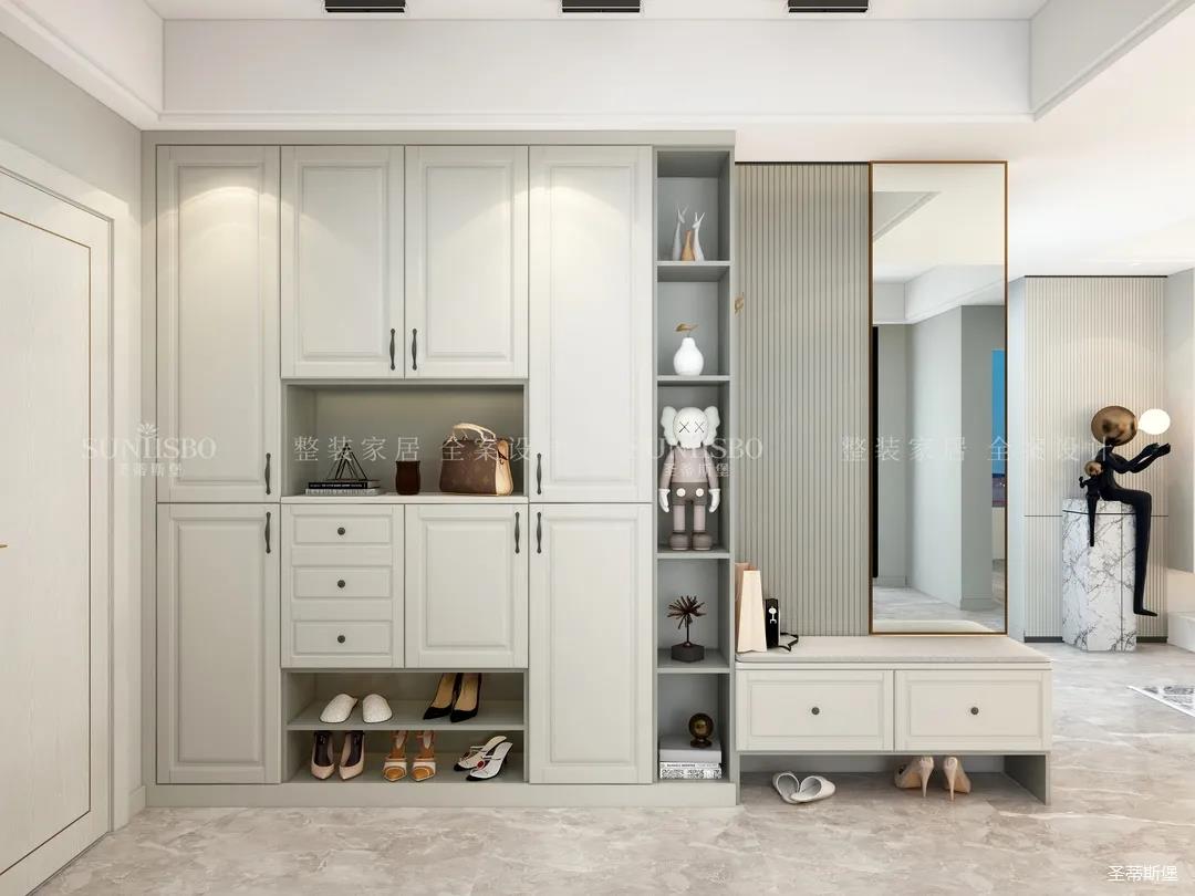 入户侧面设计一字型玄关,腰部,底部留空做层板,便于随手放置钥匙、鞋包等物品,中间留空设计为开放展示区,加上软装饰品点缀,达到业主对品质生活追求的理想状态。应女主人要求,玄关还加长延伸出妆镜和换鞋凳,让动线自然流畅。