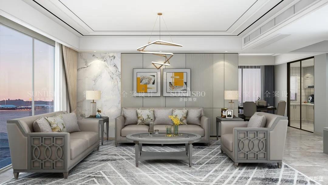 客厅在太阳的余晖下衬得柔和朴素,通透自然。超大江景落地窗,引入充足的自然光线洒向屋内,整体空间去除繁复的设计,以柔和的线条作为铺设,沙发侧面与地毯中的几何造型组建了一个极富艺术感的空间,采用天然实木材质制作的家具和织物,色彩淡雅且不张扬。随处可见的艺术造型装饰,无一不展示着美式格调中轻奢的韵味。
