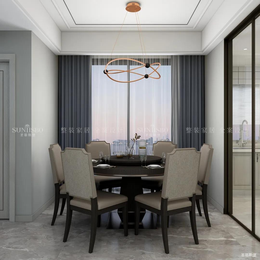 餐厅空间由于户型空间有限,仅用浅色的护墙与深色的餐桌椅,在视觉上加深空间的纵深感,打造了满足用餐、会客、社交的多重需求空间,把业主对一家人围桌用餐的憧憬变成可落地居家场景。
