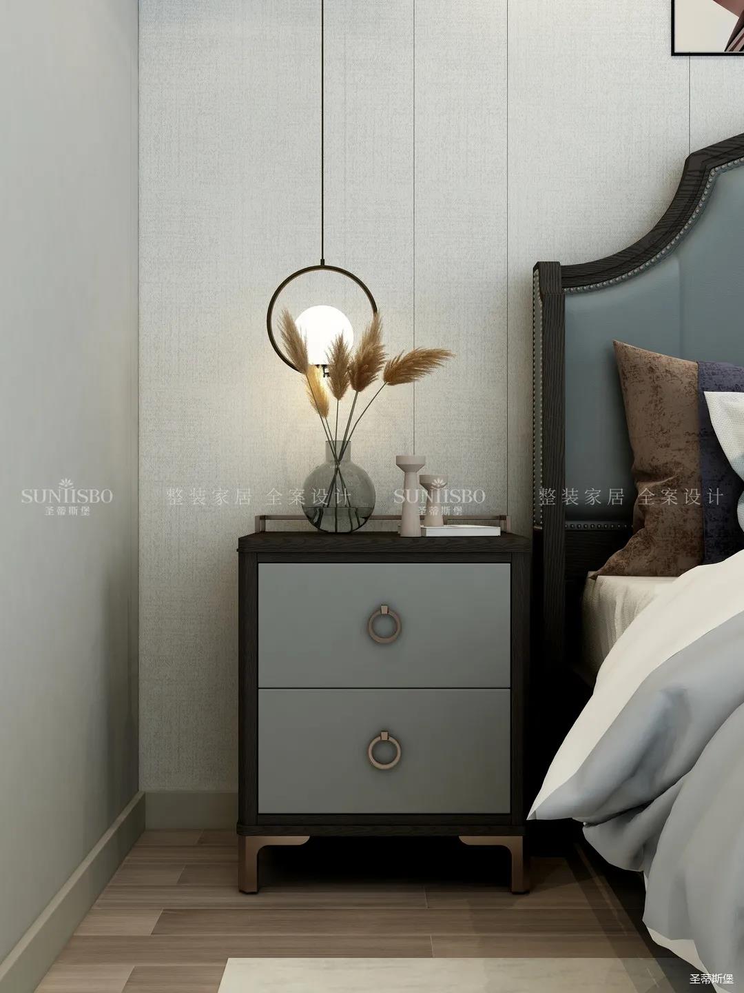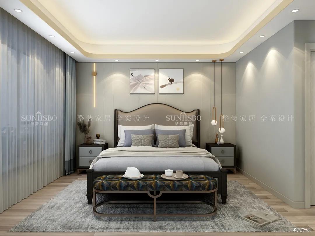 主卧整体暖色色系为空间注入了专属调性,高明度的家具色彩与整体空间区分,透过材质肌理与光线相互交叠,传达着空间里安定温暖的情绪。立体轻奢的床尾凳,提示着空间主人对时尚的高质量生活追求。