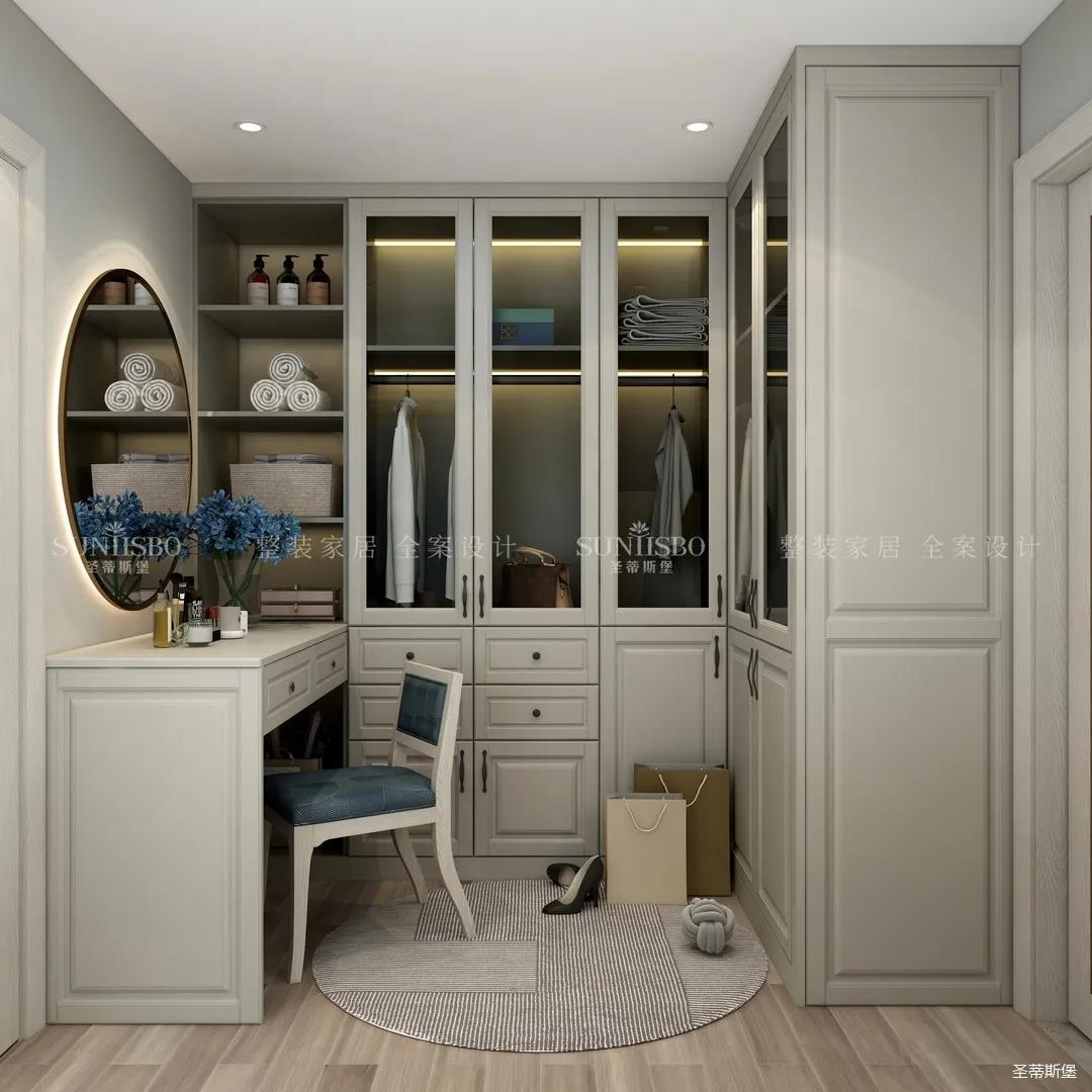 利用主卧多出来的小空间,设计打造出步入式衣帽间。定制了L型的转角衣柜,提供了超强的收纳空间。圆形的装饰地毯与妆镜相呼应,彰显着空间女主人对精致生活的态度。