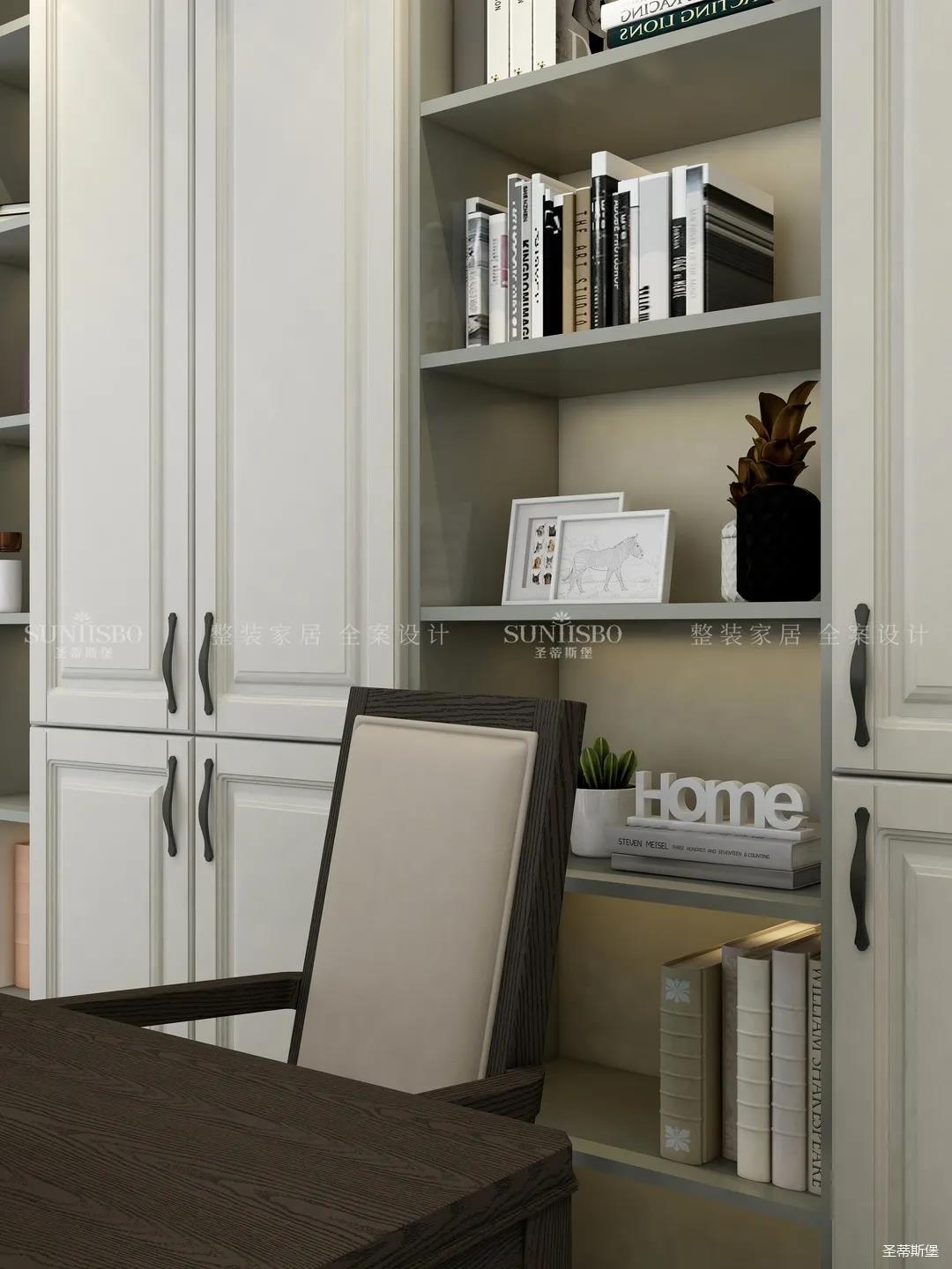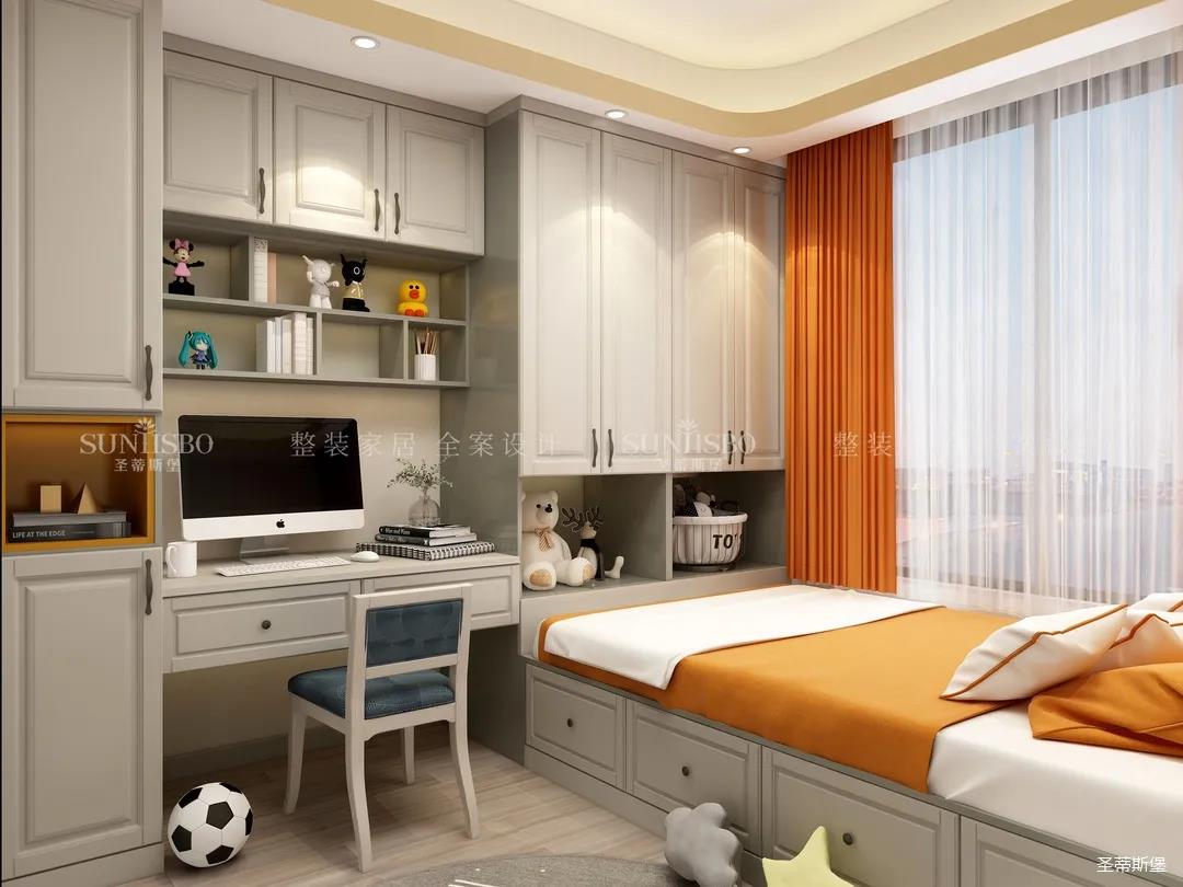 为给小朋友提供良好的居住环境,儿童房功能一应俱全,兼具开放式与封闭收纳,将儿童的学习区与休息区合理划分,打造了一个良好的生活习性,仿古白的整体柜,巧妙的将明亮橙作为撞色,令空间充满童趣与活力。