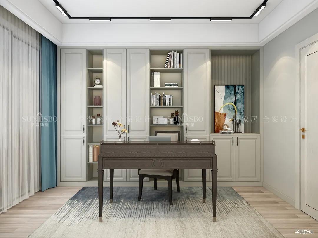 书房以黑白灰,作为打造舒适家居的经典配色。深灰书桌,浅灰地毯,仿古白定制书柜,三者搭配带着与生俱来的时尚艺术范。整体没有绚丽多彩的颜色,却总能令人耳目一新,只一眼便爱上这舒适的阅读空间。