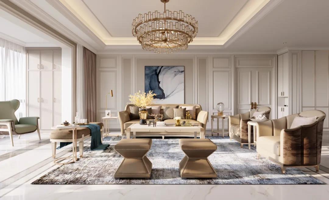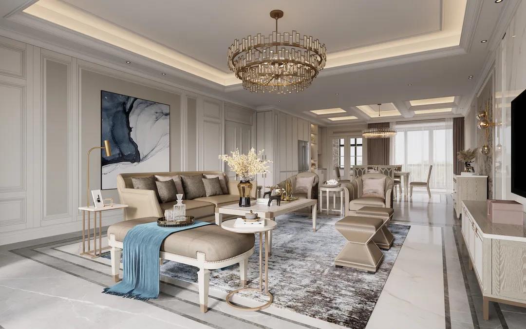 美轮美奂的天花吊顶,巧夺天工的护墙线雕,硬朗的美式线条和明亮金属的轻奢质感,均展现着高雅与浪漫的生活腔调。
